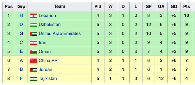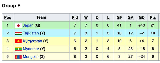 Không dừng lại ở đó, tại bảng F, đội bét bảng Mông Cổ bất ngờ có chiến thắng trước Kyrgyzstan. Điều đó ảnh hưởng không nhỏ tới thành tích của đội nhì ở bảng đấu này. Bởi vốn dĩ, nếu như Kyrgyzstan - ứng viên cho ngôi nhì bảng thắng Mông Cổ, họ sẽ có được 10 điểm sau 6 lượt đấu. Nhưng giờ đây, họ lại rơi xuống thứ 3 và nhường chỗ cho Tajikistan, đội đã đá 7 trận mà mới có 10 điểm.