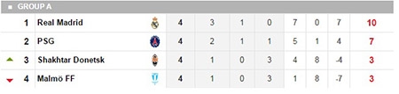 PSG lúc này có 7 điểm, trong khi cả Shakhtar Donetsk và Malmo cùng có 3 điểm. Lượt trận tới, chỉ cần giành chiến thắng trước Malmo, PSG sẽ có tấm vé đi tiếp.