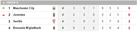 Man City đã có tấm vé vào vòng knock-out với 9 điểm. Hiện tại, đội bóng thành Manchester hơn Sevilla (đội xếp thứ 3) 6 điểm khi vòng bảng còn 2 lượt trận. Kể cả thua ở 2 trận đấu đó và Sevilla toàn thắng, Man City vẫn xếp trên do hơn hiệu số đối đầu. Với Juventus, nếu muốn sớm giành vé đi tiếp, đương kim Á quân phải đánh bại Man City ở vòng đấu tới.
