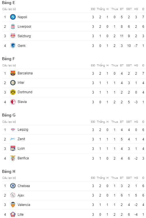 Tại bảng E, nhà đương kim vô địch Liverpool khởi đầu thất vọng bằng trận thua 0-2 trên sân của Napoli. Dù vậy, điều này cũng chẳng ảnh hưởng tới cơ hội đi tiếp khi The Kop đang đứng thứ 2 với 6 điểm, kém Napoli đúng 1 điểm. Hai đội bóng còn lại của Anh là Man City và Chelsea đều dẫn đầu bảng đấu của mình.