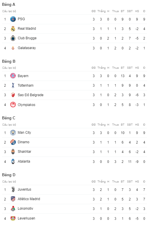 Tại bảng A, PSG thể hiện sức mạnh vượt trội khi có được 9 điểm tuyệt đối, trong đó ấn tượng hơn cả là chiến thắng 3-0 trước Real Madrid. Đội bóng Hoàng gia Tây Ban Nha dù khởi đầu chật vật nhưng cũng có được vị trí thứ 2 với 4 điểm sau chiến thắng quan trọng 1-0 trên sân của Galatasaray.