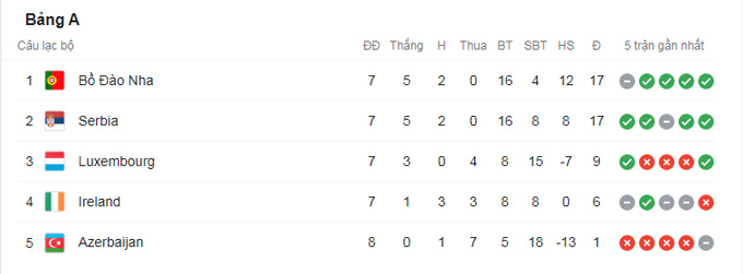 Tại bảng A, ĐT Bồ Đào Nha chỉ có trận hòa không bàn thắng trên sân của CH Ireland trong khi Azerbaijan để thua Luxembourg với tỷ số 1-3 trên sân nhà. Hiện Bồ Đào Nha đã đòi lại ngôi đầu từ tay của Serbia, đội bóng không ra sân ở lượt đấu này.