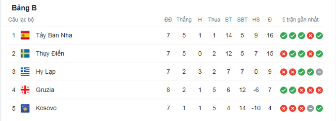 Tây Ban Nha giành chiến thắng với tỷ số tối thiểu 1-0 trên sân của Hy Lạp để trở lại ngôi đầu sau khi Thụy Điển bất ngờ để thua 0-2 trên sân của Georgia. Hiện chỉ còn Tây Ban Nha (16 điểm) và Thụy Điển (15 điểm) là hai đội bóng còn lại của bảng B cạnh tranh chiếc vé chính thức.