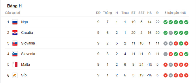 2 đội đang dẫn đầu bảng là Nga và Croatia đều có những chiến thắng hủy diệt để tiếp tục cạnh tranh nhau tới lượt đấu cuối. Nga đánh bại Đảo Síp 6-0 trong khi Croatia hạ đẹp Malta tới 7-1. Ở trận đấu còn lại, Slovakia và Slovenia cầm chân nhau với tỷ số 2-2.