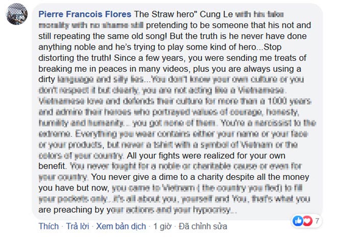 Sự kiện Victory 8 tại Hà Nội đã kết thúc được hơn 10 ngày, tới hôm nay 30/10 Pierre Flores mới biết Cung Lê nói điều không hay về mình khi nhờ những người bạn dịch hộ lời phát biểu của cựu võ sỹ Mỹ. Võ sư phái Vịnh Xuân Nam Anh không nói về trận đấu giữa hai người mà ông buông ra những lời khó nghe tới Cung Lê.