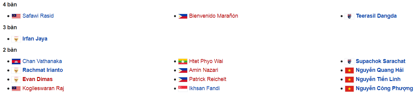Xếp sau Teerasil Dangda là cầu thủ Irfan Jaya của Indonesia với ba pha lập công. Nguyễn Quang Hải, Nguyễn Tiến Linh và Nguyễn Công Phượng là những chân sút tốt nhất của tuyển Việt Nam khi có cùng hai bàn. Đây cũng là ba cầu thủ được kỳ vọng sẽ nổ súng giúp Việt Nam hạ Thái Lan ở bán kết.