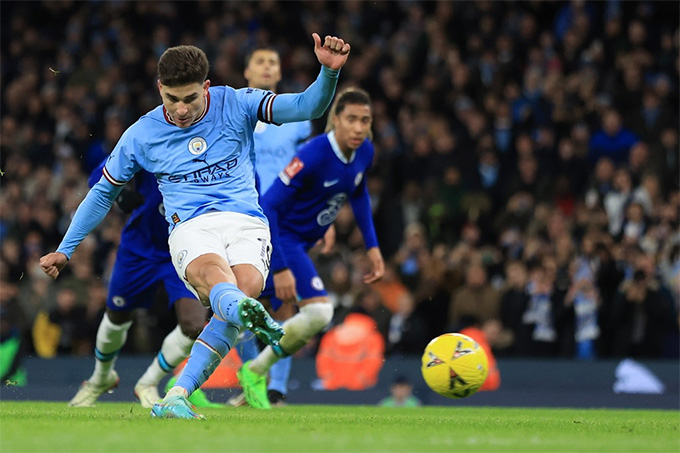 Chỉ 4 phút sau khi Chelsea bị dẫn trước, tiền vệ Havertz của họ lại báo hại đội nhà khi dùng tay chơi bóng trong vòng cấm. Ban đầu trọng tài không phát hiện ra, nhưng sau khi tham khảo VAR ông đã chỉ tay vào chấm phạt đền. Từ cự ly 11m, tiền đạo Alvarez đánh bại Kepa mang về bàn thắng thứ 2 cho Man City (30').