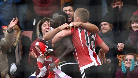 Niềm vui của các cầu thủ Southampton sau khi Mane nâng tỉ số lên 3-2. Ảnh: Reuters |