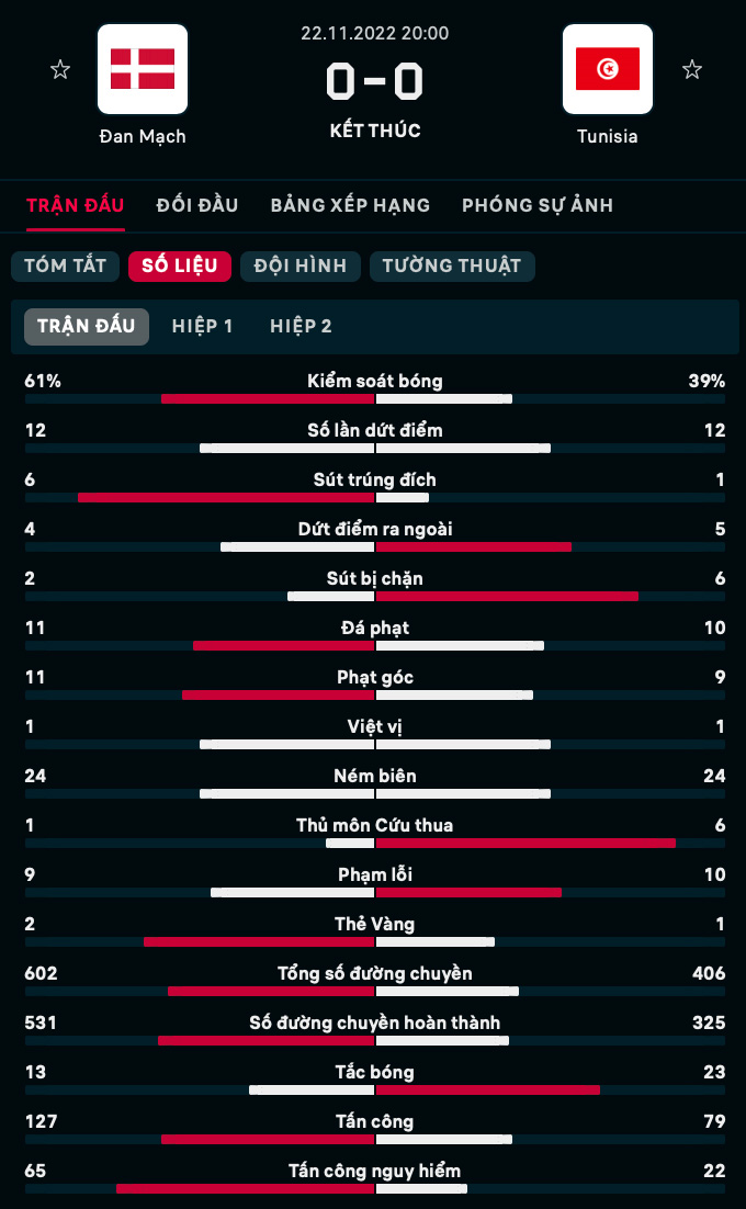 23/11/2022 05:24Đan Mạch và Tunisia chia điểm trong trận cầu không bàn thắng