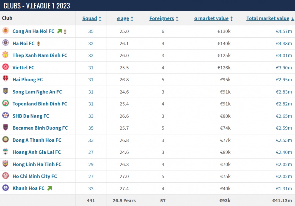 Trong khi đó, Hà Nội FC cũng đã leo lên vị trí thứ 2 trên bảng xếp hạng các đội bóng giá trị nhất V-League 2023, sau khi bổ sung 3 ngoại binh ở giữa mùa giải. Đội chủ sân Hàng Đẫy hiện có giá 4,48 triệu Euro.