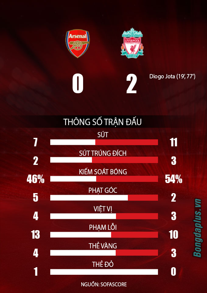 Mặc dù thi đấu không quá vượt trội so với Arsenal, nhưng sự nguy hiểm trong các pha lên bóng của Liverpool đã tạo ra khác biệt. Phút 19, Trent Alexander-Arnold thực hiện pha chuyền bóng rất nhanh để Jota dùng tốc độ và kỹ thuật loại bỏ Takehiro Tomiyasu trước khi tung ra cú dứt điểm hiểm hóc đánh bại thủ thành Aaron Ramsdale mở tỷ số trận đấu.