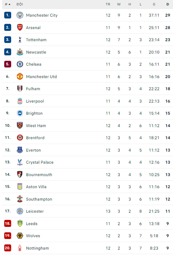BXH Ngoại hạng Anh 2022/23