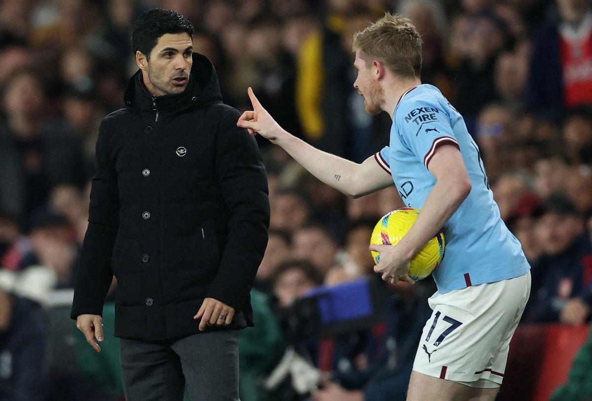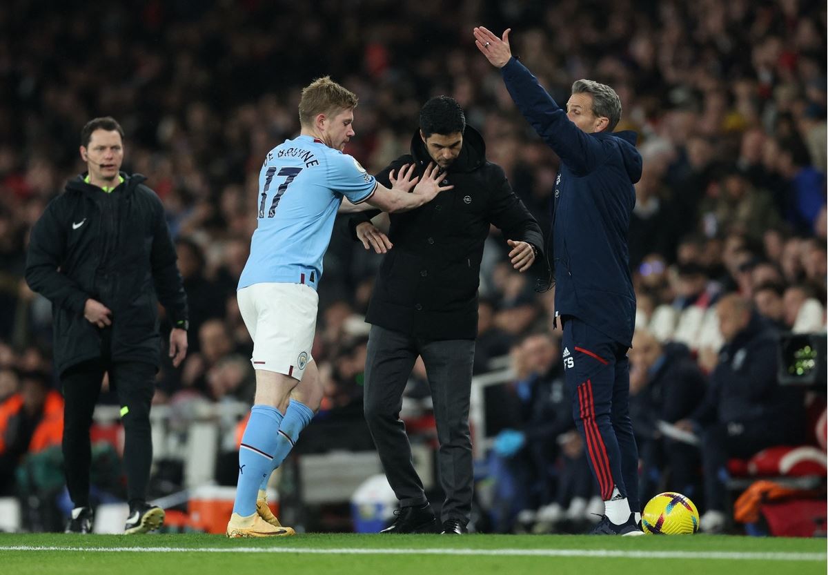 De Bruyne tức giận đẩy mạnh HLV Mikel Arteta ra khỏi đường biên. Tiền vệ người Bỉ thậm chí nổi cáu và chỉ tay vào mặt trợ lý HLV cũ của Man City để bày tỏ sự giận dữ về tình huống tiểu xảo này.