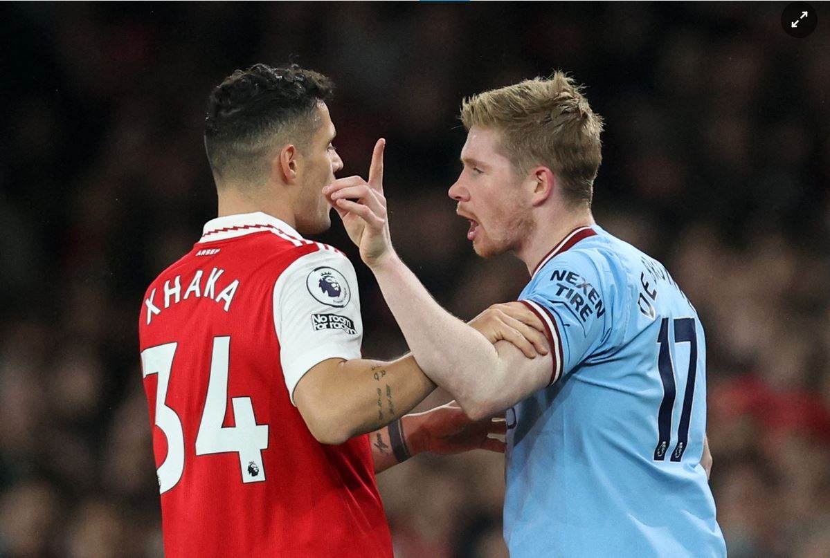 Granit Xhaka ngay lập tức chạy đến để bảo vệ vị thuyền trưởng của mình. Không có xô xát xảy ra giữa cầu thủ hai đội khi Man City nhanh chóng đưa bóng nhập cuộc trở lại.
