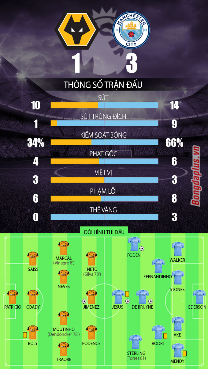 Dù rất hưng phấn sau bàn gỡ, nhưng hơn 10 phút cuối trận, Wolves không thể tạo ra thêm cơ hội nào thực sự rõ nét. Không những thế, việc mải mê dâng cao tấn công khiến họ trả giá. Ở giây bù giờ cuối cùng của trận đấu, tiền đạo Gabriel Jesus cướp được bóng và thực hiện cú dứt điểm khẽ chạm chân hậu vệ Wolves khiến thủ thành Patricio bó tay, qua đó ấn định chiến thắng 3-1 cho Man City.