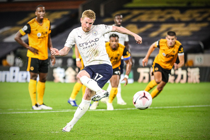 Ngôi sao người Bỉ chính là cầu thủ thi đấu nổi bật nhất trong đội hình của Man City. Ngay phút thứ 11, De Bruyne đã cảnh báo hàng thủ Wolves bằng cú đá phạt kỹ thuật từ ngoài vòng cấm khiến thủ thành Patricio vất vả cản phá. Đến phút 19, vẫn là cầu thủ số 17 thực hiện pha xâm nhập vòng cấm và bị Romain Saiss phạm lỗi. Một quả phạt 11m dành cho Man City và chính De Bruyne là người thực hiện chính xác để mang về bàn mở tỷ số cho Man City.