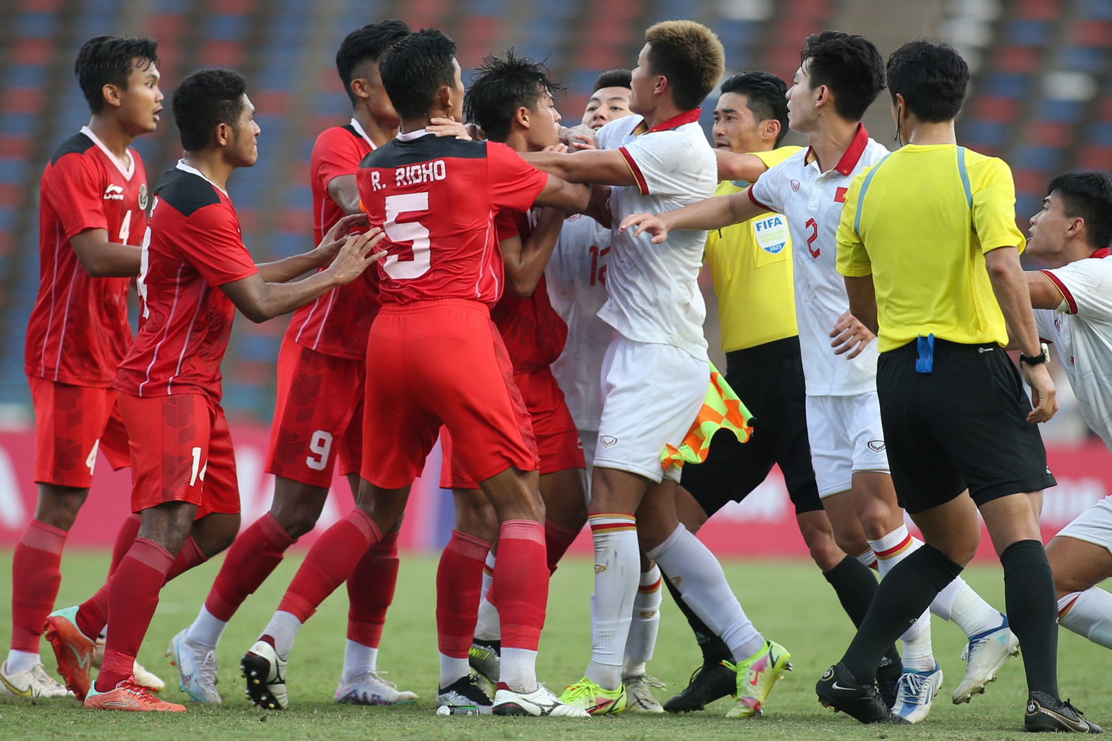 Cuối hiệp một, không khí trận đấu trở nên nóng hơn khi các cầu thủ liên tục va chạm và tranh cãi nảy lửa.