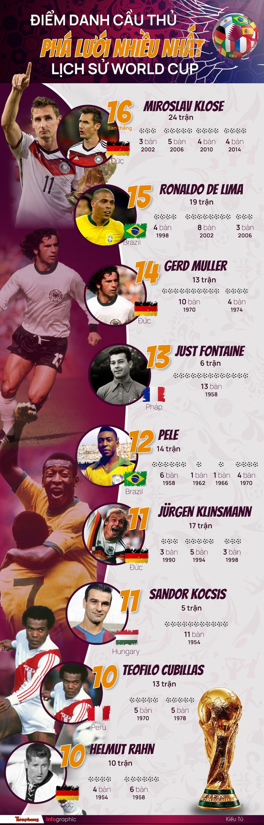 World Cup 2022 sẽ khởi tranh ngày 20/11, đây là một trong những giải bóng đá danh giá và hấp dẫn nhất hành tinh. Chính vì thế, các cầu thủ luôn muốn ghi thật nhiều bàn thắng, để có tên trên bảng vàng. Hãy cùng Tiền Phong điểm danh các cầu thủ 'phá lưới' nhiều nhất lịch sử World Cup.