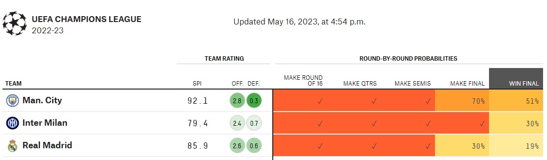 Cho đến lúc này, dù Inter Milan đã đặt chân vào chung kết, nhưng hãng siêu máy tính FiveThirtyEight chỉ đánh giá đội bóng Italia có 30% cơ hội vô địch. Như vậy, 70% đội vô địch Champions League năm nay sẽ là kẻ thắng trong trận đấu đêm nay, trong đó, Real Madrid chỉ có 19% cơ hội.