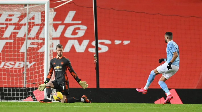 Phút 35, đến lượt De Bruyne chọc khe cho Mahrez băng lên từ cánh phải. Ở vị trí thuận lợi, tiền vệ người Algeria dứt điểm quá hiền và bị De Gea cản phá. De Bruyne đá bồi, nhưng bóng đi vọt xà.