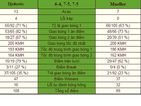 Set 3 là kịch bản của set 2. Mueller vẫn thi đấu rất quyết tâm khiến Nole phải đổ mồ hôi. Phải đến game thứ 11, tay vợt số thế giới mới có được break để vươn lên dẫn 6-5 và sau đó kết thúc trận đấu bằng một game thắng trắng khi cầm giao bóng.