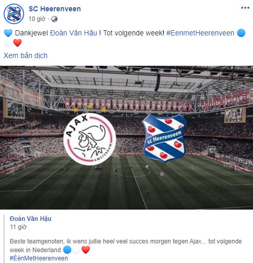 Trên trang cá nhân của mình, Hậu gửi lời chúc đến SC Heerenveen bằng tiếng Hà Lan: "Beste teamgenoten, ik wens jullie heel veel succes morgen tegen Ajax... tot volgende week in Nederland" (tạm dịch: Các đồng đội thân mến, chúc mọi người thi đấu thật tốt trước Ajax vào ngày mai. Hẹn gặp mọi người vào tuần sau ở Hà Lan).