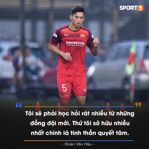 "Tôi nghĩ mình rất may mắn khi được đội bóng lựa chọn. Thứ tôi sở hữu nhiều nhất có lẽ là tinh thần quyết tâm tập luyện và thi đấu. Còn những yếu tố khác tôi vẫn phải học hỏi rất nhiều. Mục tiêu lớn nhất của tôi là tập luyện thật tốt để được thi đấu và cố gắng học hỏi từ HLV, các đồng đội và cố gắng hết mình.", Văn Hậu nói tiếp.