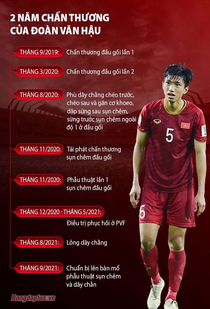 Văn Hậu gặp đa chấn thương trong một buổi tập hồi tháng 10/2020 của CLB Hà Nội dù không va chạm với các đồng đội. Từ đó tới nay, hậu vệ quê Thái Bình đã có 2 lần phẫu thuật.
