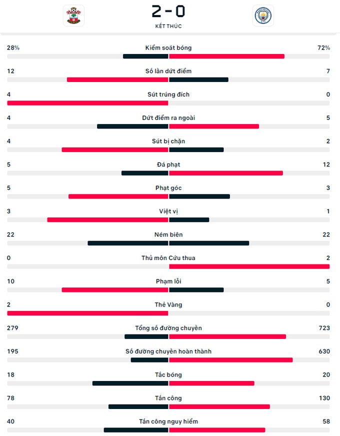 Man City trải qua 90 phút mà không có nổi một cú sút trúng đích đành chính thức nói lời chia tay cúp Liên đoàn Anh từ vòng tứ kết. Với Southampton, dù đang đứng bét bảng Ngoại hạng Anh nhưng đội chủ sân St. Mary's đang thi đấu rất tốt tại các cúp khi đã vào bán kết cúp Liên đoàn Anh và vòng 4 FA Cup.