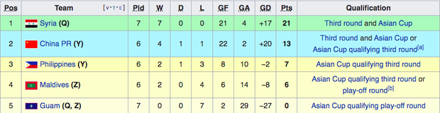 Hiện tại, Trung Quốc đang có 13 điểm sau 6 trận đấu. Trừ đi thành tích 2 trận đối đầu với đội cuối bảng Guam, thầy trò HLV Lý Thiết chỉ còn vỏn vẹn 7 điểm và hiệu số bàn thắng bại +6, không nằm trong tốp 5 đội nhì bảng có thành tích tốt nhất.