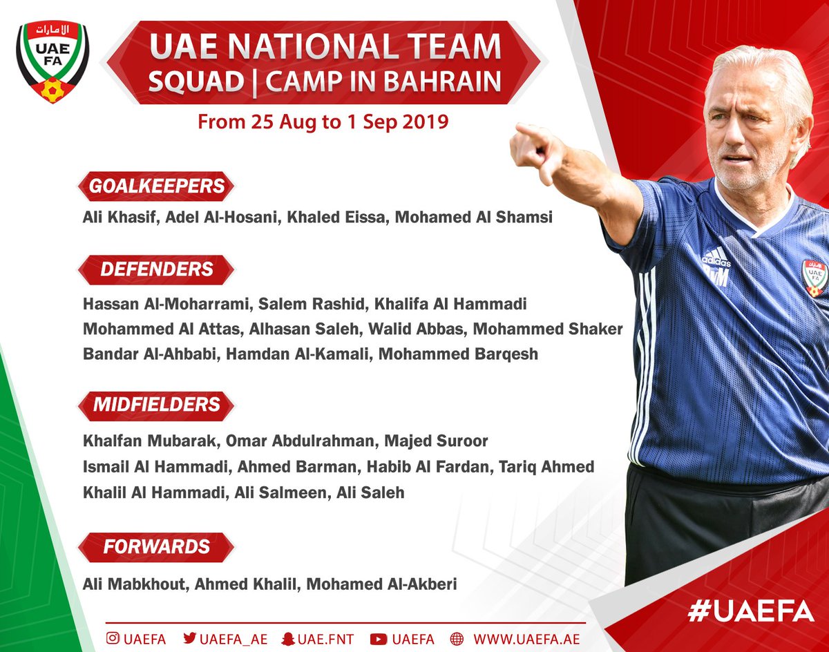 Theo đó, 4 ngôi sao lớn nhất của bóng đá UAE thời điểm hiện tại đều được triệu tập, đó là tiền đạo Ali Mabkhout, Ahmed Khalil, cầu thủ chạy cánh Khalfan Mubarak và nhạc trưởng Omar Abdulrahman.