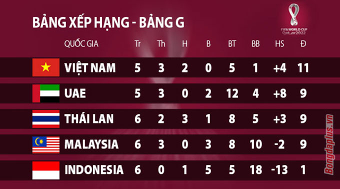 Ở trường hợp UAE hoà Thái Lan, hai đội sẽ có cùng 10 điểm, tức là kém Việt Nam khi đó 4 điểm. Nên nhớ, Thái Lan vẫn đá nhiều hơn Việt Nam 1 trận khi ấy.