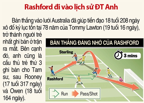 18 năm sau ngày Michael Owen ra mắt, 13 năm sau ngày Wayne Rooney trình làng, nước Anh lại chào đón một ngôi sao mới, thậm chí còn hứa hẹn hơn hai người kia. Chỉ 135 giây khi tiếng còi bắt đầu trận đấu với Australia rạng sáng qua, cái tên Rashford đã hiện lên bảng tỷ số. Tiền đạo 18 tuổi di chuyển, phối hợp với Sterling, sau đó kiếm vị trí thuận lợi để dón đường bóng đưa ngược trở ra, dứt điểm chìm bằng chân phải đánh bại thủ môn của Australia.