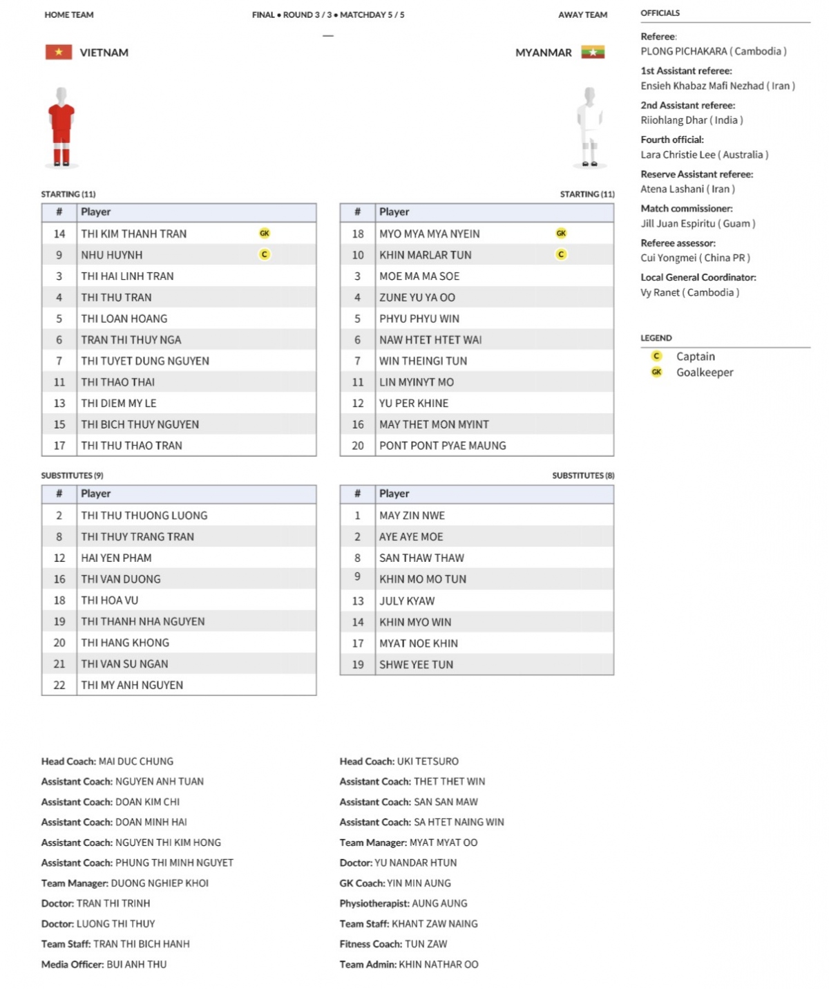 ĐT nữ Việt Nam: Kim Thanh, Hải Linh, Hoàng Thị Loan, Thúy Nga, Diễm My, Tuyết Dung, Thu Thảo, Thái Thị Thảo, Trần Thị Thu, Bích Thùy, Huỳnh Như