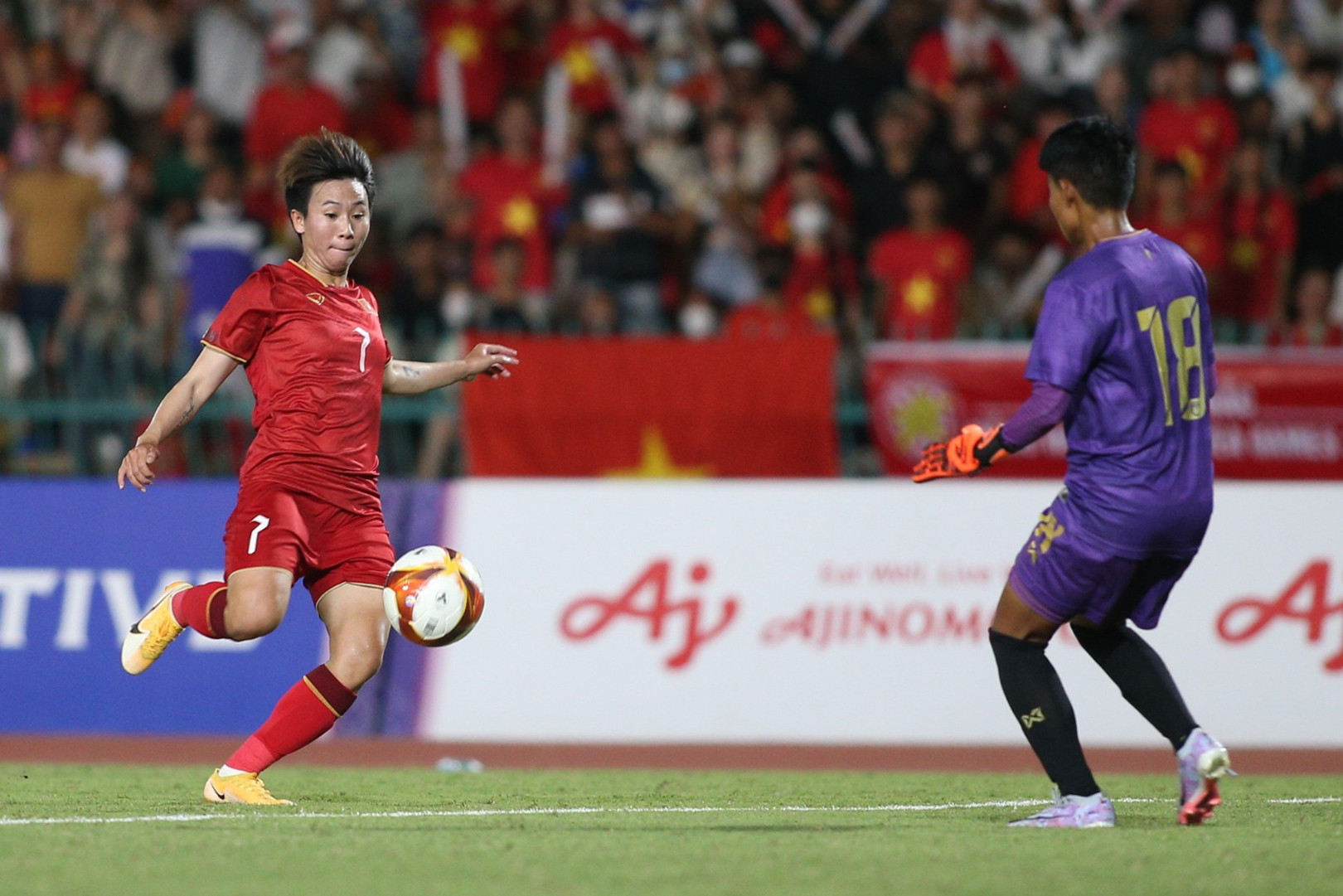 Tuyết Dung đoạt bóng trong pha tranh chấp với cầu thủ Myanmar rồi chuyền xuống cho Huỳnh Như. Thủ quân Việt Nam đảo bóng qua hậu vệ cuối cùng bên phía đối phương rồi sút chéo góc bằng chân trái nhưng không thể đánh bại thủ môn Mya Nyein.