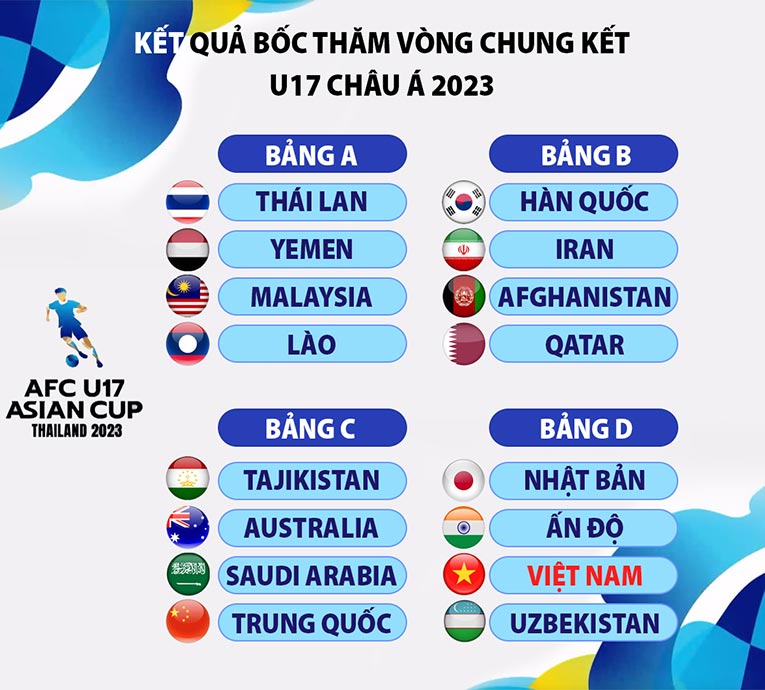 Tại lễ bốc thăm vòng chung kết U17 châu Á 2023 vừa diễn ra tại Bangkok, Thái Lan. 16 đội góp mặt được chia làm 4 bảng. Theo kết quả bốc thăm, các bảng đấu lần lượt như sau.