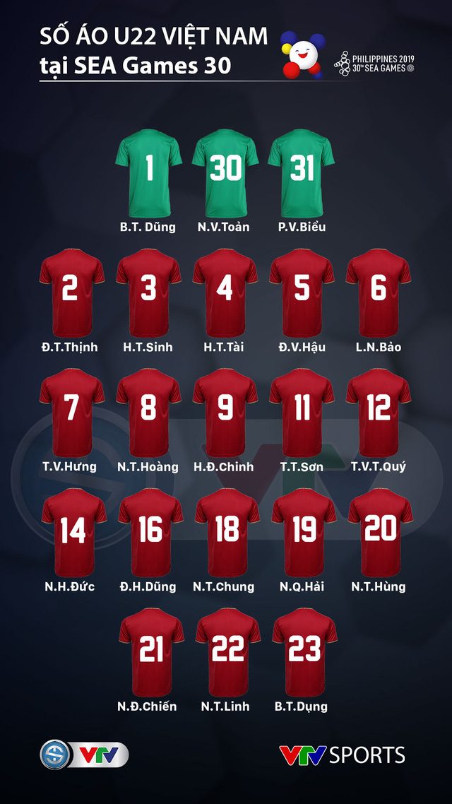 Trước giờ lên đường sang Philippines dự SEA Games 30, U22 Việt Nam đã công bố số áo thi đấu của các cầu thủ. Đáng chú ý, U22 Việt Nam không có cầu thủ nào nhận đeo áo số 10.