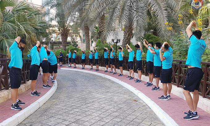Sáng nay, đội tuyển khởi đầu ngày mới tại Dubai với các bài thể dục thư giãn gân cốt và đi dạo trong khuôn viên khách sạn trước khi dùng bữa điểm tâm. Khách sạn Swisshotel Al Murooj Dubai là nơi đội tuyển đóng quân trong thời gian tập huấn tại UAE do LĐBĐ Việt Nam bố trí. Đây là khách sạn cao cấp có đầy đủ tiện nghi, đặc biệt là sở hữu không gian rất thoáng mát và rộng rãi, giúp các cầu thủ không cảm thấy bị gò bó trong bối cảnh các hoạt động cá nhân rói riêng và tập thể nói chung bị hạn chế do ảnh hưởng của dịch COVID-19.
