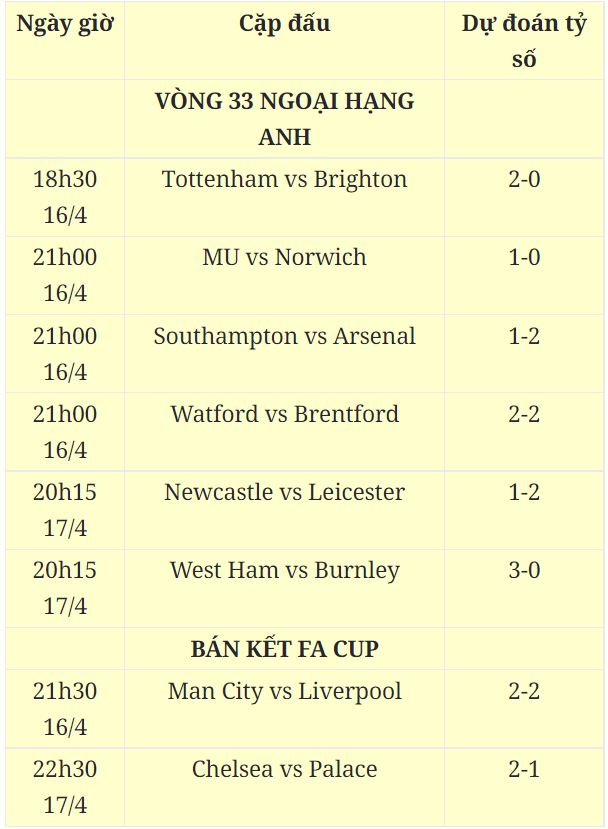 15/04/2022 21:18Dự đoán bóng đá Anh cuối tuần này: MU thắng trở lại, Man City, Chelsea vào chung kết FA Cup