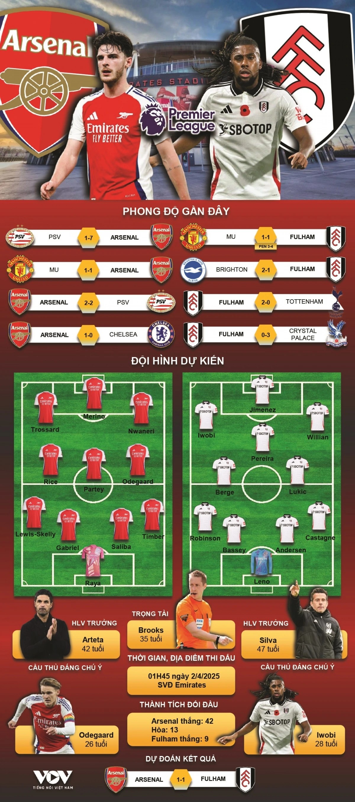 Dự đoán kết quả và đội hình ra sân trận Arsenal vs Fulham, thuộc khuôn khổ vòng 30 Ngoại hạng Anh 2024/2025 diễn ra lúc 01h45 ngày 2/4.