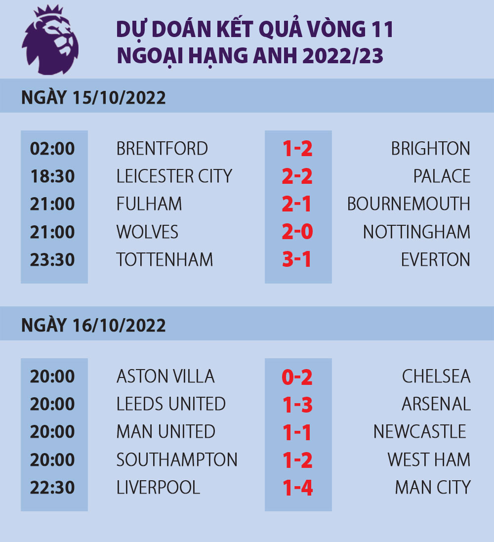 14/10/2022 21:19Dự đoán kết quả vòng 11 Ngoại hạng Anh: Man City 'thổi bay' pháo đài Anfield