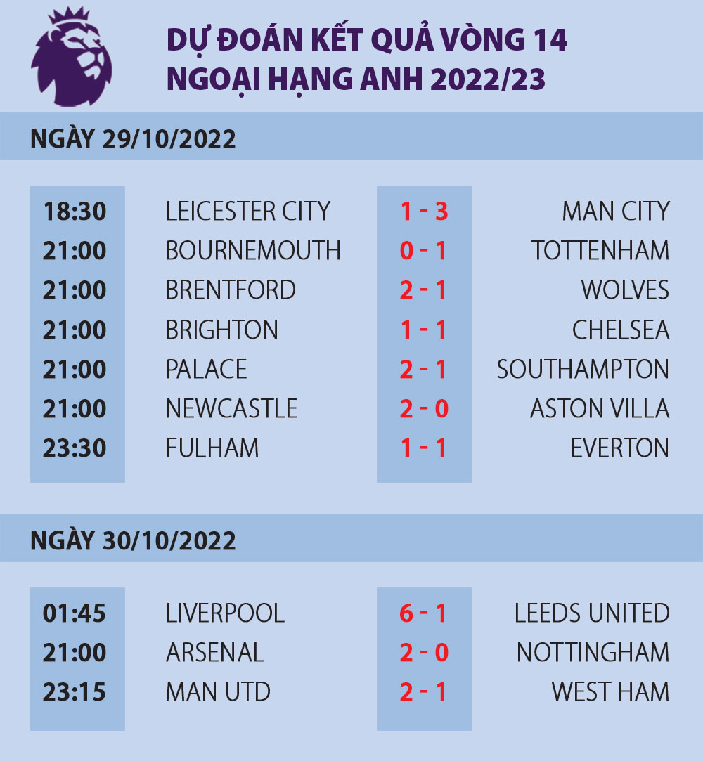 28/10/2022 23:31Dự đoán kết quả vòng 14 Ngoại hạng Anh: Liverpool 'thổi bay' Leeds, Chelsea bị chia điểm
