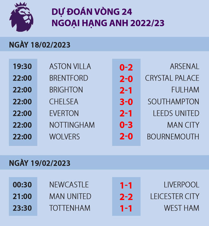 17/02/2023 21:18Dự đoán kết quả vòng 24 Ngoại hạng Anh: Arsenal và Man City cùng thắng, MU dễ sảy chân