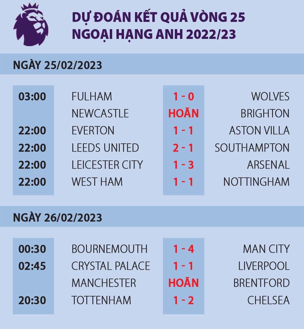 24/02/2023 22:20Dự đoán kết quả vòng 25 Ngoại hạng Anh: Arsenal và Man City cùng thắng, Liverpool lại mất điểm