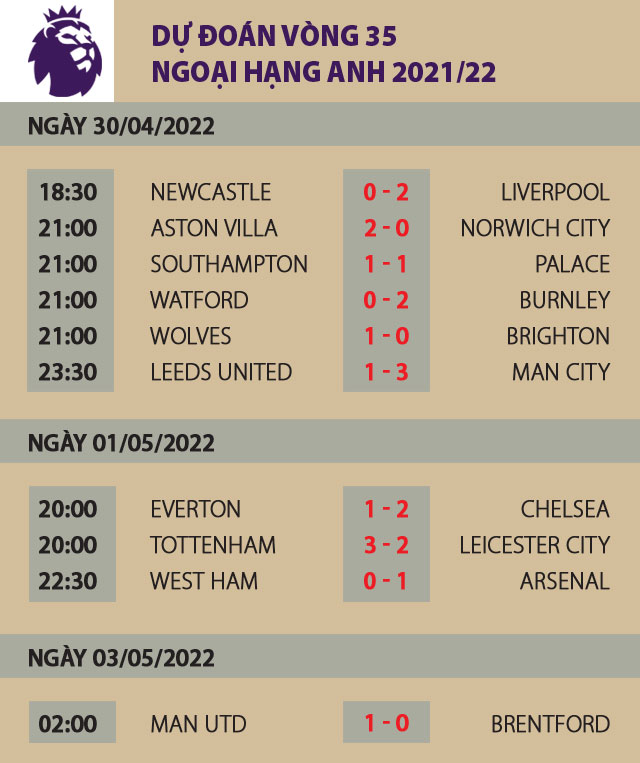 Giống như Arsenal, Liverpool cũng phải làm khách ở vòng 35. Đối thủ của họ là Newcastle vừa gây ấn tượng với chiến tích giành được điểm số tối đa ở 4 vòng gần nhất. Tuy nhiên, so với Liverpool đang cạnh tranh quyết liệt với Man City trong cuộc đua tới ngôi vô địch, Newcastle thua kém cả về động lực lẫn đẳng cấp. Sẽ là bất ngờ nếu họ buộc chuỗi trận thắng liên tiếp của Liverpool phải dừng lại ở con số 4.