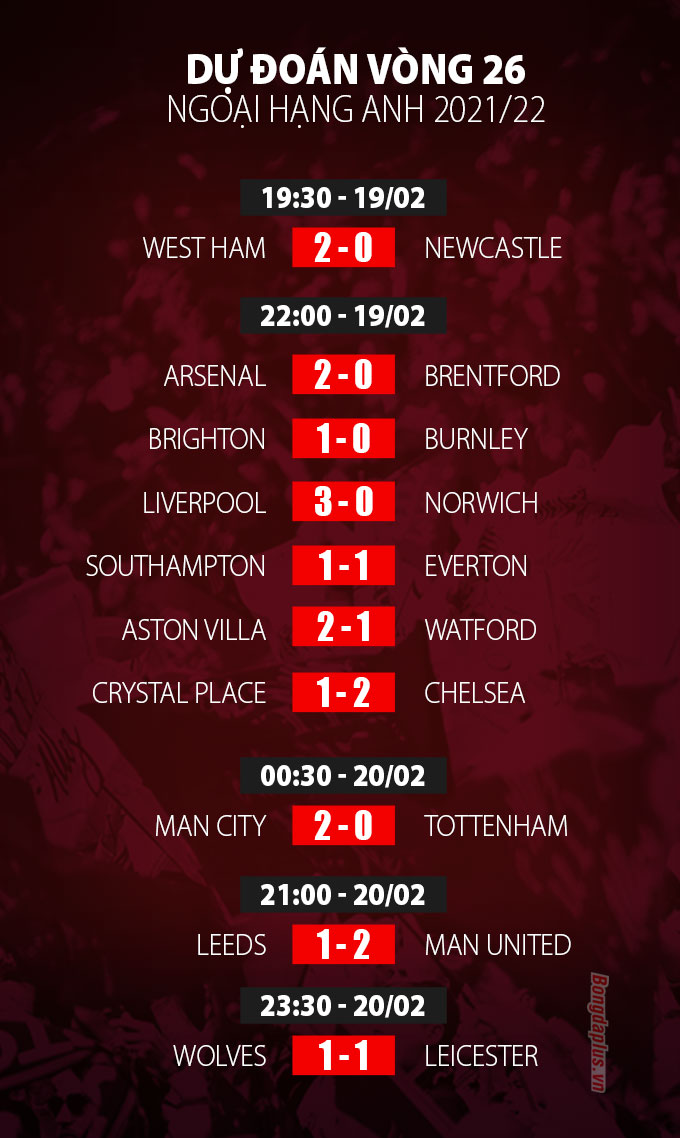18/02/2022 20:40Dự đoán vòng 26 Ngoại hạng Anh: MU nối dài mạch thắng, Man City 'đè' Tottenham