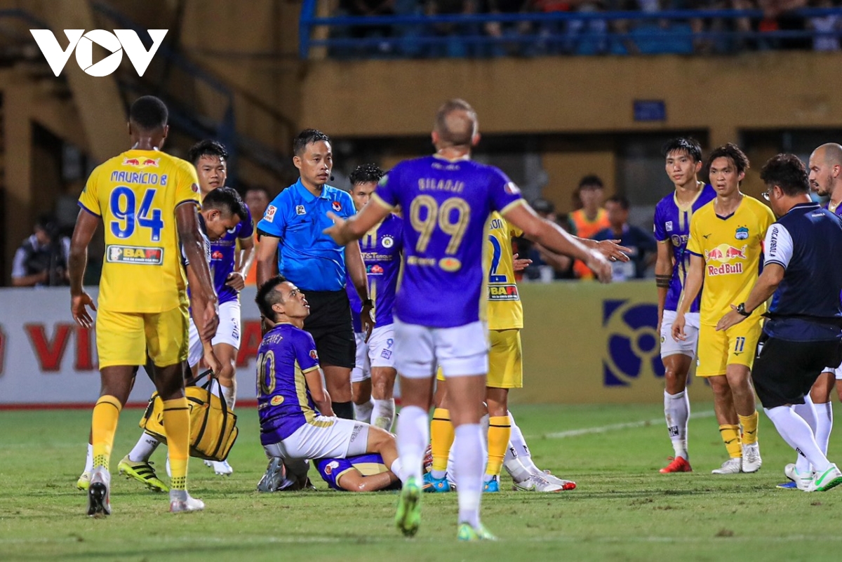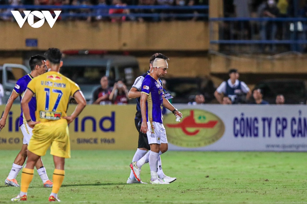 Tiền vệ Đức Huy đổ máu sau pha va chạm với đồng đội Tuấn Hải và phải tới bệnh viện khi trận đấu Hà Nội FC 2-1 HAGL vẫn chưa kết thúc.