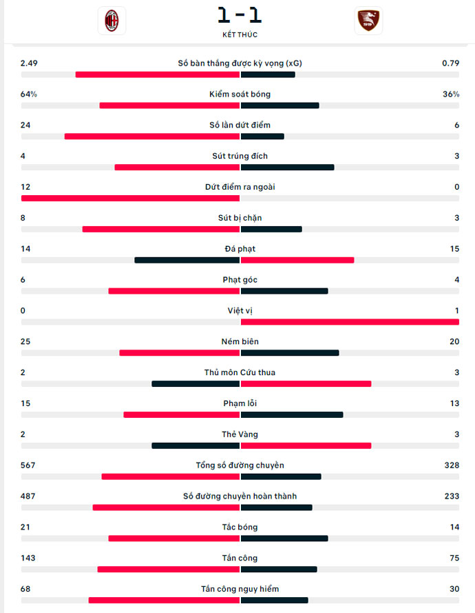 Các cơ hội được tạo ra rất nhiều nhưng các chân sút của Milan không thể kiếm nổi bàn thứ 2. Với kết quả này, Milan đứng thứ 4 trên BXH Serie A khi có 47 điểm còn Salernitana xếp thứ 16 với 25 điểm.