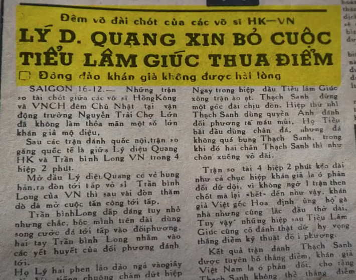 Tất cả khán giả đều đứng bật dậy, hồi hộp theo từng nhịp đếm của trọng tài, rồi vỡ òa trong tiếng reo: "Trần Bình Long đã hạ nốc ao Lý Diệu Quang của Hồng Kông".