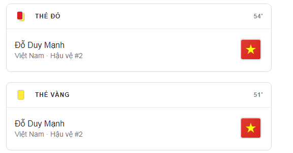 Không dừng lại ở đó, trung vệ mang áo số 3 của tuyển Việt Nam còn phải nhận thẻ vàng vì lỗi này. Trước đó ít phút, Duy Mạnh cũng đã bị phạt thẻ vàng sau khi tình huống kết thúc tấn công của Ả Rập Xê Út kết thúc. Điều này đồng nghĩa với việc, hậu vệ tuyển Việt Nam bị truất quyền thi đấu.